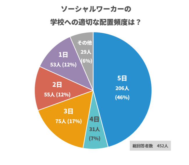 SSWの学校への適切な配置頻度としては、「5日」が46%と最も多い結果となりました。その他は、「1日」「2日」は12%、「3日」は17%、「4日」は7%と、回答のばらつきが見られました。