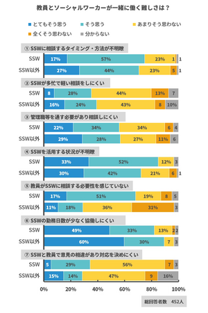 教員からはSSWとの連携の必要性を感じる声が多く集まりましたが、一方で、「SSWとどう連携すれば良いかわからない」「連携しても業務の負担が減るわけではない」という声もありました。SSWからは、SSWの活用方法の不明瞭さや教員とのコミュニケーション機会の少なさによって、上手く支援に入れないもどかしさを感じているという声が多く集まりました。