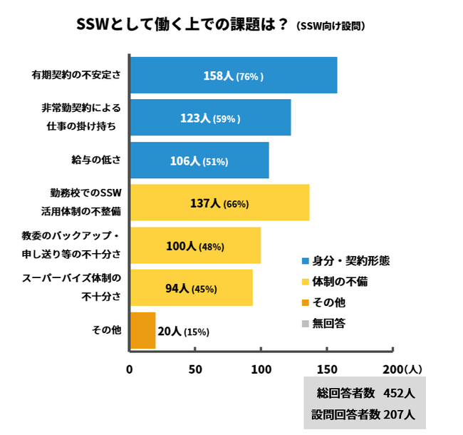 SSWとして働く上での課題としては、多い順に「有期契約という身分の不安定さ(76%)」「勤務校でのSSW活用体制の不整備(66%)」「非常勤契約による仕事の掛け持ち(59%)」という結果となりました。支援の体制が整っていないことに加え、雇用の不安定さを課題に感じている人が多いようです。