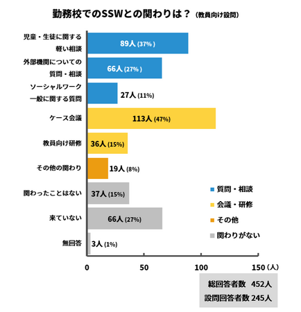 勤務校でのSSWとの関わりについては、多い順に「ケース会議(47%)」「児童・生徒に関する軽い相談(37%)」「外部機関についての質問・相談(27%)」という結果となりました。「来ていない(27%)」「関わったことはない(15%)」という回答も目立ちました。