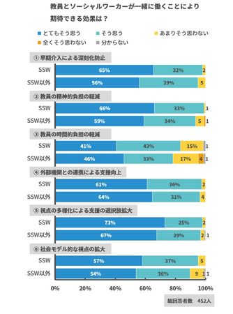 「視点の多様化による支援の選択肢拡大」「教員の精神的負担の軽減」「外部機関との連携による支援向上」「早期介入による深刻化防止」は9割以上が「とてもそう思う」「そう思う」と回答しました。「教員の時間的負担の軽減」については、「あまりそう思わない」「そう思わない」と回答した人が最も多い結果となりました。SSWとSSW以外での大きな回答の違いは見られませんでした。