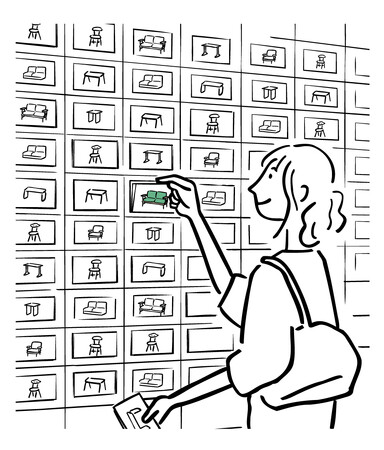 【提供体験一例】 ●カードクリッピング ENENの主要家具が、1枚ずつカードになって壁に収納されています。気になる家具のカードをピックアップし、手元で並べたり、重ねたりして、各家具のテイストやカラー等の相性をイメージしていただけます。カードは持ち帰り可能で、表面記載のQRコードを読み取ると該当の商品ページに飛び、連動しているAR/VRコンテンツを使って自宅等でゆっくり検討していただけます。