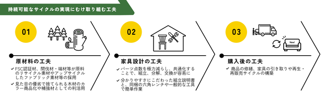 ENENオリジナルのモジュラー家具「KUUM」シリーズの基本コンセプトである「メンテナンスや修理がしやすく、丈夫で長く使えること」に加えて、家具の引き取り、再生・再販売サイクルの構築に力を入れてまいります。お客様にも捨てない取り組みに関わっていただくことで、共に持続可能なサイクルの実現に寄与します。 また、可能な限り環境負荷の少ない素材と生産方法を積極的に採用することを方針としています。FSC認証取得の木材や、間伐材・端材などを原料としたリサイクル材の使用に加え、見た目の優劣で捨てられてしまう材料は、着色した商品や、表に出てこない部分の補強材など、工夫して使用しています。また、衣料品の裁断屑を再利用したアップサイクルのファブリック素材や、再生プラスチックで作られた素材を採用しています。