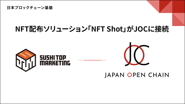 web3ビジネスに最適なブロックチェーンインフラ「Japan Open Chain」のコンソーシアムを運営・管理する日本ブロックチェーン基盤株式会社(代表取締役:近藤 秀和、以下、当社)は、SUSHI TOP MARKETING株式会社(本社:東京都千代田区、代表取締役CEO:徳永大輔、以下、SUSHI TOP MARKETING)が提供するNFT配布ソリューション「NFT Shot(特許出願中)」のJapan Open Chainへの接続が完了し、Japan Open Chain上でウォレットレスで誰でも簡単に受け取れるNFTの生成に対応したことをお知らせいたします。