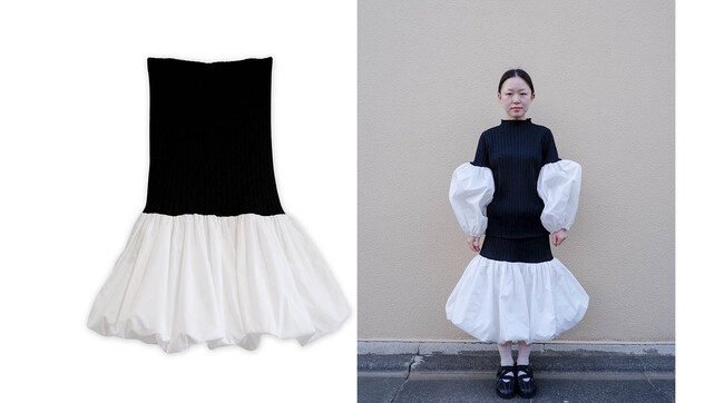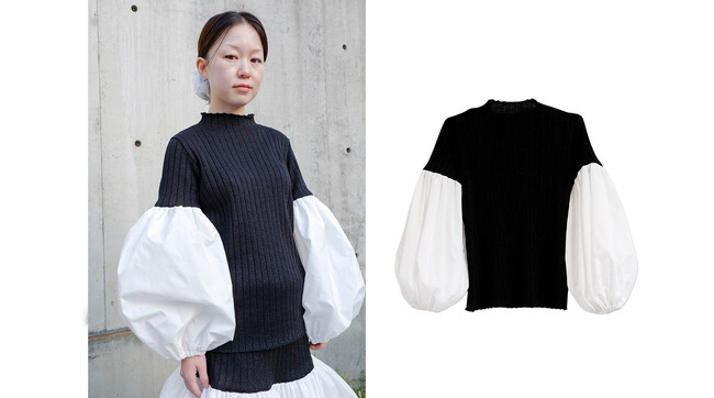 ラメが入ったニット素材を使用し、パフスリーブにはチュールを挟んでボリュームを出しメインで着れるトップスに。タイトなシルエットでありながらも、スタイルが良く見える形にしました。軽くシワにもなりにくい為、旅行にもオススメです。