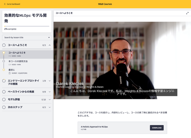本コースはW&B社のレジデントAIエンジニアによって作られた完全オンラインのMLOps学習コースです。Fast.aiの主要開発メンバーであるHamel Husain、W&Bの教育プログラムディレクターでKaggleマスターでもあるDarek Kleczekなどによって開発された本コースは下記の章立てで構成されており、MLOpsの基礎とW&Bを使ったワークフローのインプリメンテーションを学ぶのに最適なコースです: