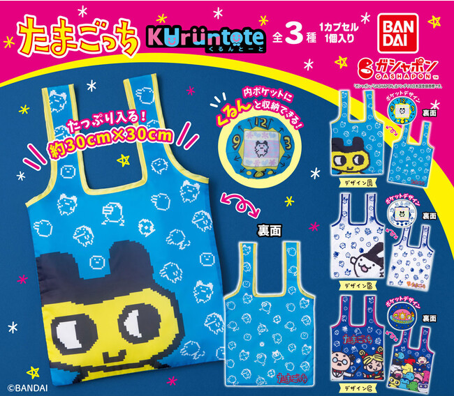 〜たまごっち本体柄がデザインされた内ポケットの中にトートバッグ本体を入れて携帯できる、くるんとーとやワンピースとコラボしたラバーマスコットを展開〜