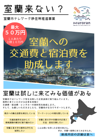 室蘭市テレワーク移住等推進補助金:https://www.city.muroran.lg.jp/main/org2200/telework_iju.html