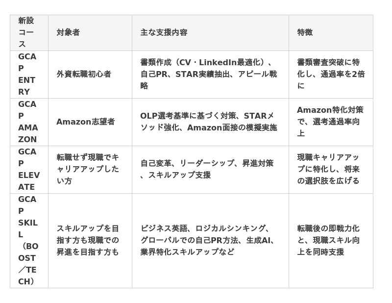 GCAPプログラムは、外資系・グローバル企業でのキャリアを加速させたい個人の方を対象としたプログラムで、書類作成、面接対策、スキルアップまで、キャリア全体をサポートしています。これまでに多くの受講者が転職成功を果たしており、特にAmazonへの転職希望者から多くの要望を受けて、以下の新コースを追加しました。[表: https://prtimes.jp/data/corp/137525/table/4_1_db1241cdb275019062f01d4010ae7a44.jpg ]