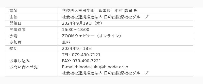 介護・保育・医療サービスを提供する社会福祉連携推進法人 日の出医療福祉グループ(所在地:兵庫県加古川市、代表理事:大西奉文)は、学校法人玉田学園 理事長 中村忠司氏によるセミナーを開催いたします。