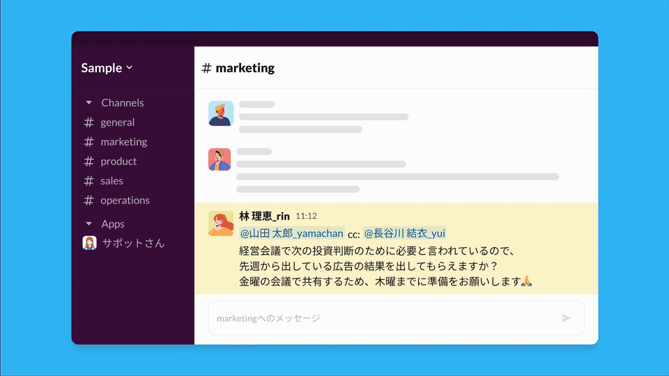 調整の負担を減らすSlack×AIタスク管理「サポットさん」。AI進行ウォッチ機能でチーム状況を俯瞰し、優先タスクや期限を把握。会話遡りも減らし、フォロー漏れを防ぎます。
