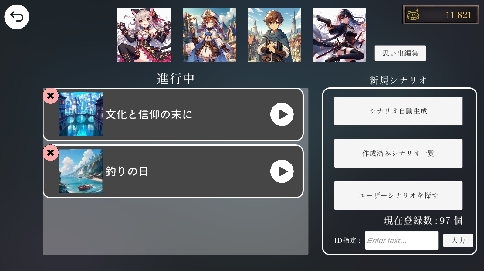 長期記憶が搭載されたシナリオモードでは、ユーザーは好きなパーティを組み、数々のシナリオをプレイすることができます。