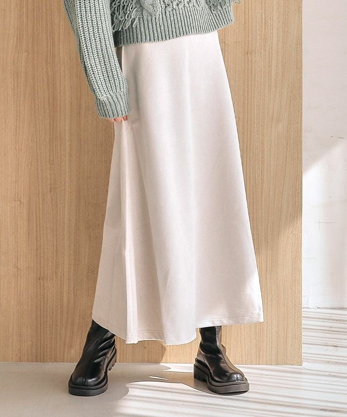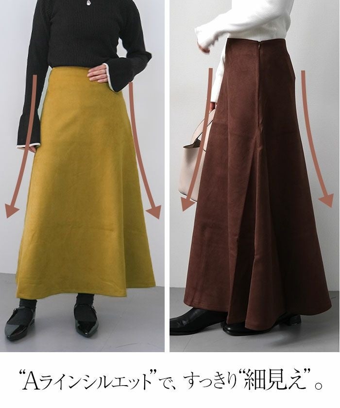 1.■ スエード風ロングスカートで“旬の素材”投入まずご紹介するのは、とことん美シルエットに拘ったスエードAラインフレアロングスカート。スエード調の素材感が高級感&秋冬らしい暖かみを演出してくれます。長めのロング丈+Aラインで美脚効果も狙える上、最大の特徴は伸縮性抜群のスエード調の生地を採用し、快適さを最重視した点です。さらに、セミハイウエストと絶妙なフレアラインを施し、気になる腰やお尻周りを拾わない設計に。きれいめにもカジュアルにも振りやすい万能型で、例えばざっくりニットと合わせて“休日のちょっとお出かけ”スタイルに、またはテーラードジャケットと合わせて“きれいめオフィス”にも対応。