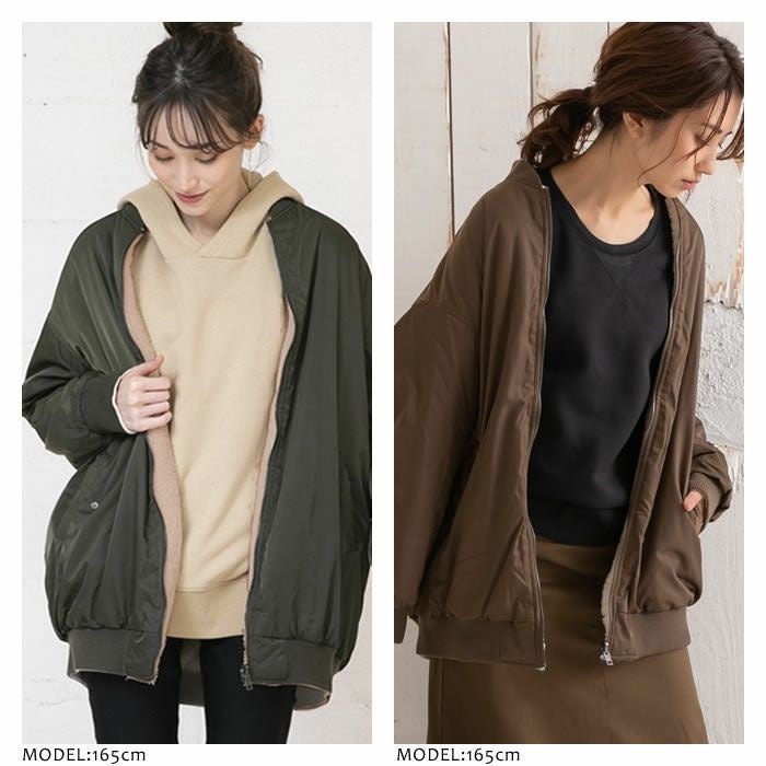 2.■ リバーシブルMA-1裏ボアブルゾンで“防寒×おしゃれ”次にご紹介するアウター、リバーシブルMA-1 裏ボアブルゾン。ミリタリー定番のMA-1デザインに、裏地を独自開発のボア仕様で真冬でも安心の暖かさ。着膨れしないのに保温性が抜群で、腰回りをすっぽり隠すので気になるヒップラインもすっきりカバーしてくれます。さらにリバーシブルで使えるというお得感。下に合わせるざっくり系のゆったりニットもダボつくことなく着こなせます。秋から冬にかけて「アウターどうしよう?」と迷ったとき、1枚で複数の表情を楽しめるのは嬉しいポイントです。例えば、表をミリタリーグリーンでカジュアルに、裏をもっとベーシックな色で大人っぽく、なんて着回しも可能。