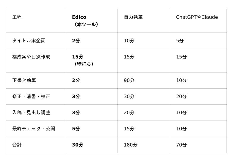 Edicoでは、AI編集者との壁打ちを通じて、ネタ出しと構成整理を行い、そのまま記事生成と文体再現まで一気通貫で進めることができます。そのため、記事1本あたりにかかる時間は20〜30分程度が目安で、今回の比較では代表モデルとして約30分を置いています。スキマ時間にスマホで取り組めることも特徴です。