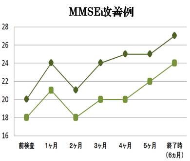 認知機能障害を持つ被験者37名を対象に行われた臨床研究。「改善は不可能」が常識とされる中、検査前に30点満点中平均19.3点であったMMSEテスト*結果が、一日に1,000μgのプラズマローゲンを6カ月摂取することにより、平均21.5点にまで改善。被験者によっては、20点から27点[正常と診断されるスコア)まで改善した例も確認されました。