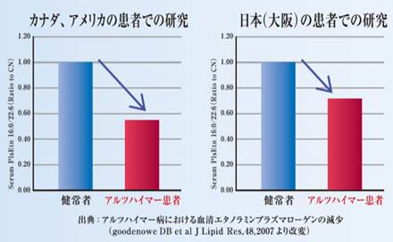 脳や心臓、血液など、人の体内に存在するリン脂質(細胞膜を形成する主な成分)の一種。アルツハイマー型認知症患者ではこのプラズマローゲン量に減少が見られます。近年の研究で、脳神経細胞に存在するプラズマローゲンが、脳の根本的な機能に大きく関与していることが明らかになってきています。 また、プラズマローゲンは脳のストレス、疲労でも減少するため、早めの段階での対策が求められます。