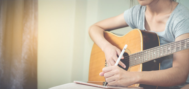 Aさんはシンガーソングライターです。自室でふと良いフレーズを思いついたので、ギターを手にとって鼻歌を歌ってみます。繰り返し歌っているうちにサビのメロディができあがり、続いてAメロ、Bメロも完成しました。忘れないようにスマートフォンに録音しました。まだ簡単なギター+鼻歌のような状態ですが、素敵な曲になる予感がします。