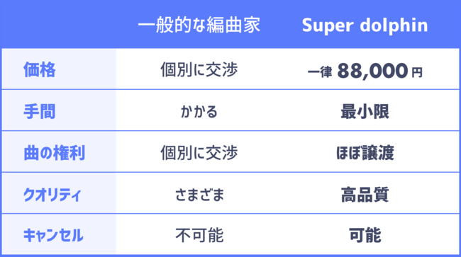 ソングライター(依頼者)から見た、一般的な編曲家とSuper dolphinへの依頼の違いをまとめました。