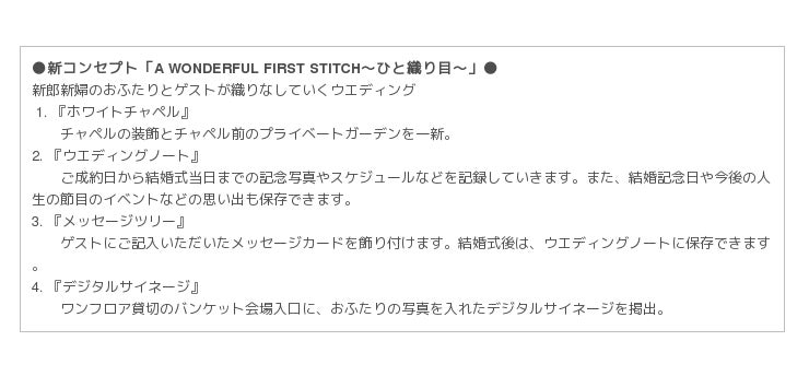 新コンセプトは「A WONDERFUL FIRST STITCH〜ひと織り目〜」。新郎新婦おふたりとゲストが織りなしていくウエディングとして、人生の節目に何度もホテルに戻ってきていただきたいという想いが込められています。また、コンセプトを一新したことにより、おふたりの人生を織りなしていくツールとして新たなアイテムを導入いたしました。