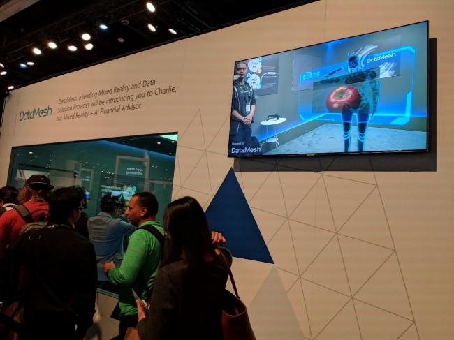 DataMeshグループが展示した内容は人工知能(AI)とMRを組み合わせたバーチャルの投資顧問ロボット『チャーリー』で、マイクロソフト社が描くMRの今後の方向性と合致するものでした。