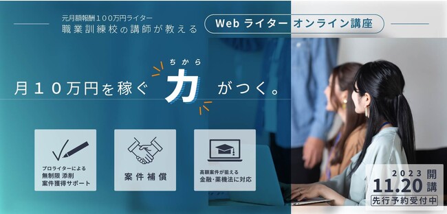 本講座では、フリーランサー時代に月額報酬100万円を実現した経歴を持つ職業訓練校講師が、Webライターとしてこれまで獲得したノウハウを詰め込んだカリキュラムを構築。まったくの初心者から、Webライターとして活動しながらもなかなか高額案件を受注できない方向けに、月10万円を稼ぐことを目標に掲げた内容となっています。
