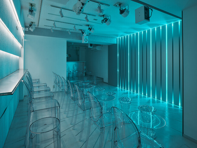 全ての音楽ジャンルに対応するべくデザインされた店内は青白いネオン色に包まれ、演奏が始まると華やかなステージ照明に切り替わるダイナミックな演出が可能。