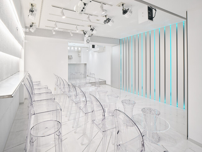 真っ白な壁と床に音響設計を考慮したメタリックな素材を合わせ、SF映画のワンシーンのような近未来的な内装となっている。そこへ佇むグランドピアノはベヒシュタインの珍しい白色カラー。