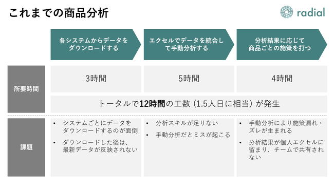 アパレル企業に限らず、データ分析において「あれも知りたい、これも知っておいたほうがいい」と分析の幅を広げる傾向は非常に多いですが、radialは豊富なユーザーインタビューに基づき、過不足ない情報の可視化を実現しています。
