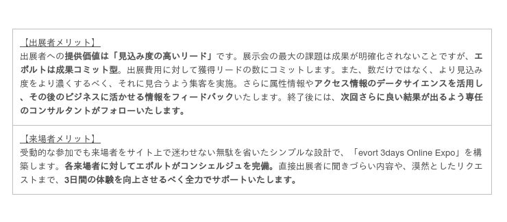 このような課題に対し、エボルトは、通常時の展示会をオンラインへ「代替」する形ではなく、オンラインで開催する価値を引き出し、通常の展示会の課題解決を徹底的に目指しました。