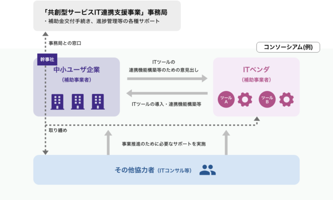 ITツールを利用する複数の中小ユーザ企業と、連携機能構築等を行う複数のITベンダが中心となり、必要に応じてその他協力者を巻き込みつつ、コンソーシアムを組成し本事業へ申請します。