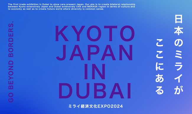 本展示会「Kyoto Japan in Dubai」は、ドバイ政府公認のもとドバイにて初開催となる日本に特化したBtoB総合展示会で、王族、VIP、企業など5万人の来場を想定しております。世界貿易の玄関口の役割を担うドバイでのビジネスマッチングを通じて、商品およびサービスを世界市場へ展開する機会を提供いたします。