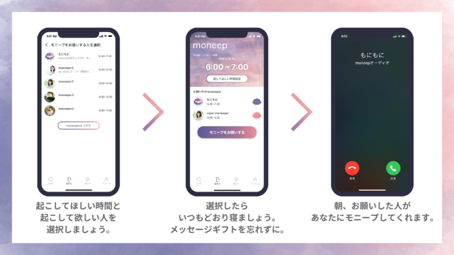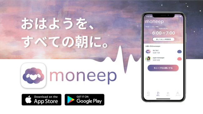 株式会社moneep(本社:東京都千代田区、代表取締役CEO:堀口 凌佑)は、ユーザーがアプリ上で「起こして欲しい人」を選択し、クリエイターと依頼者が“実際に会話ができる”、次世代型朝専用SNSアプリケーション【moneep(モニープ)】のAndroid版を本日より配信開始致しましたので、お知らせ致します。本アプリは、“世界一気持ちの良い目覚めの提供”をモットーに、世界中の人々の目覚めを繋ぎ、新しい価値体験を創出して参ります。尚、iOS版は5月にスタートをしております。