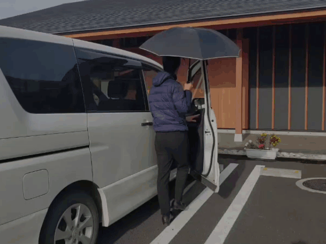 傘を閉じている間に、服も車も濡れる。大雨の時は車に乗り込む"隙"に濡れてしまうことがあります。NURASANは、ボタンを押すだけで傘が閉じるのでドアを開きながらサッと車へ。降りるときもパッと開いて濡れる"隙"をつくりません。傘の外側は濡れていないので、車の中をびしょ濡れにする心配もいりません。
