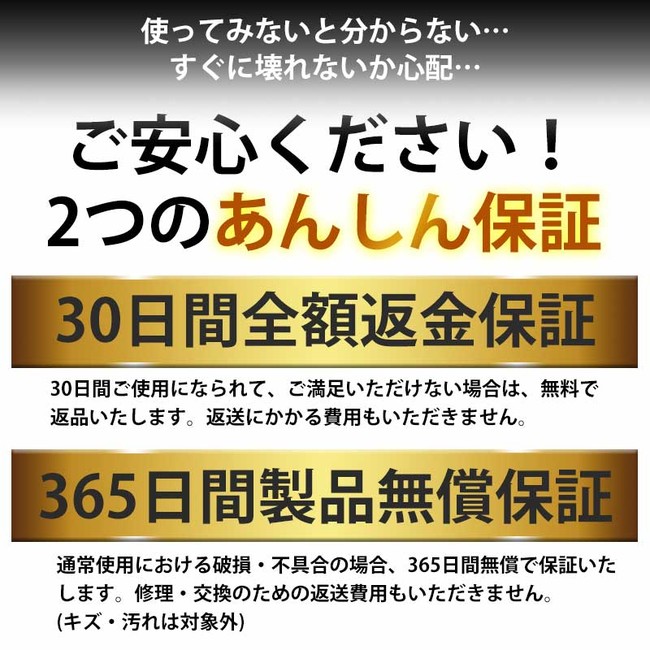 「壊れないか心配…。」という声をたくさんいただきました。そこで、通常使用における破損や不具合は365日間無償で修理もしくは交換を実施しております。返送費用もいただきません。