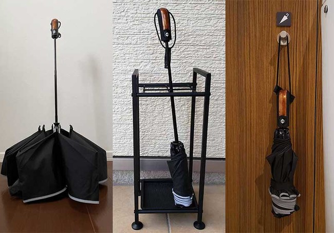これまでの一般的な折りたたみ傘とは違い、折りたたむ方向を逆にすることで”たたんでも手が濡れない、雨粒が外に飛び散らない”。片手でボタンを押すだけのワンタッチ開閉にすることで、荷物を抱えていても”車の乗り降りで濡れない”。