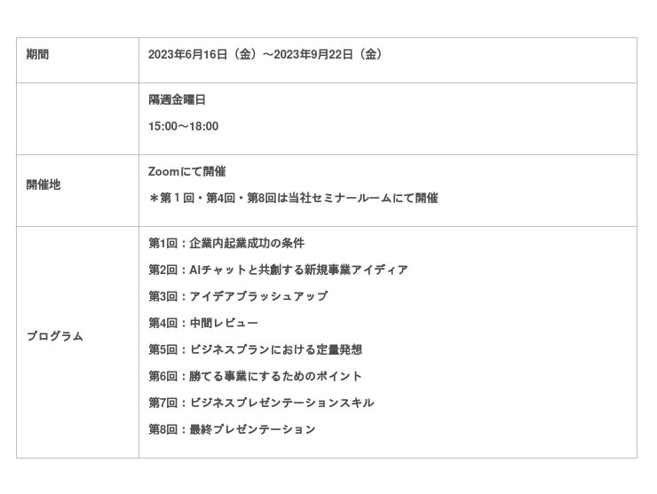 AIチャット(ChatGPT/Google Bard)を事業計画のアシスタントとして使う手法をレクチャーすると共に、インキュベーション歴10年以上のコンサルタントがAIに置き換わることのない経験を生かして伴走するという、二つの軸をもって企業内起業家をサポートします。