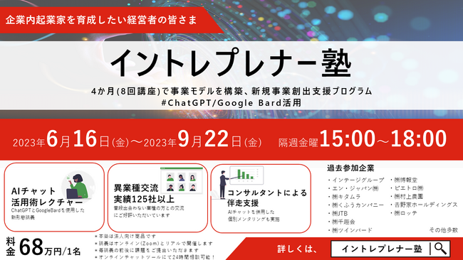 【AI×起業塾】新規事業担当者 育成アクセラレータープログラム「イントレプレナー塾」がAIチャット「ChatGPT」「Google Bard」を活用した講座を導入しリニューアル開講