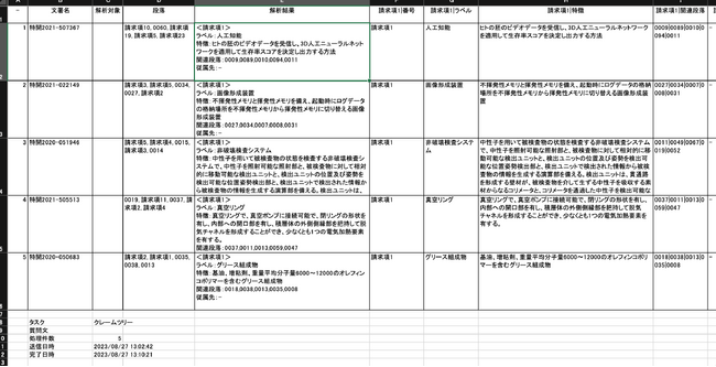 - 分類作成:特許文書に対して技術分野、課題、解決手段などの分類種別に従って新たな分類を作成