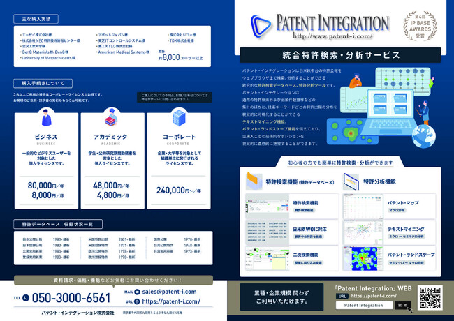 パテント・インテグレーションは、日米欧国際公開、台湾の特許公報が収録された特許データベースと、特許データベースと連動した高度な分析支援機能をウェブブラウザから利用できる特許検索・特許分析サービスです。