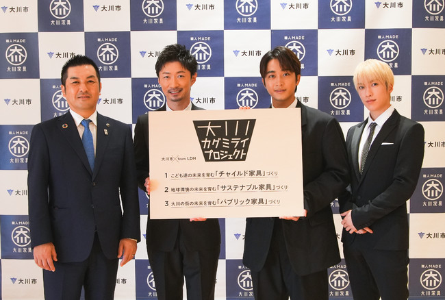 そしてこの度、黒木氏のバトンを受け継ぐ形で、EXILE MAKIDAI氏、福岡出身の劇団EXILE 佐藤 寛太氏、THE RAMPAGE 藤原 樹氏の3名がグループを超えてタッグを組み、Team LDH 「2022年度大川家具スペシャルアドバイザー」として就任いただくことをお知らせいたします。これに伴い、8月 19 日(金)大川市子育て支援総合施設 モッカランドにて就任式を実施いたしました。また、就任式と同時に、大川家具が未来に向けて新たな挑戦を行う「大川カグミライプロジェクト」を発表し、Team LDHの3名にもご参加いただくことが決定しました。