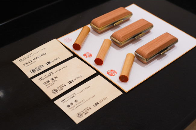 就任式ではまず、大川市長からMAKIDAI氏、佐藤氏、藤原氏の3名に、委嘱状の交付が行われました。また、木材でオリジナル製作した名刺、印鑑も交付し、それぞれ巨大名刺もお渡ししました。就任の挨拶では、代表してリーダーのMAKIDAI氏が「みなさんはじめまして。Team LDH、リーダーのEXILE MAKIDAIです。同じくEXILEの黒木啓司の後任として、頑張ります!よろしくお願いします!」と語りました。