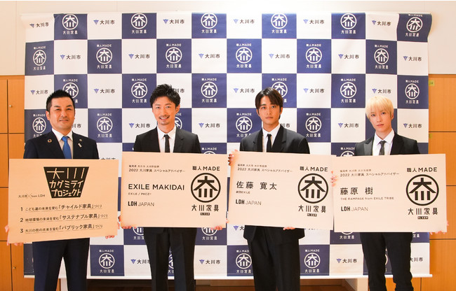 EXILE MAKIDAI氏をリーダーに、福岡出身の劇団EXILE 佐藤 寛太氏、THE RAMPAGE 藤原 樹氏が2022年度大川家具スペシャルアドバイザーに就任