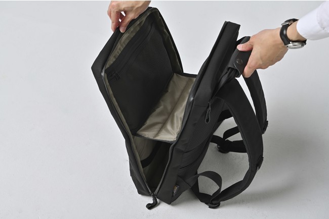 リュックから荷物が取り出しにくくなるのは、上から詰められた荷物が、背負って動くことで混ざりあってしまうからだと考え、リュックの中を仕切りによって「上下2部屋構造」にし、ファスナーもリュックの底まで付けました。こうすることで荷物が混ざりにくくなると共に、1階部分に財布などよく使うものを入れれば、リュックを正面に回して横からワンアクションで出し入れできます。