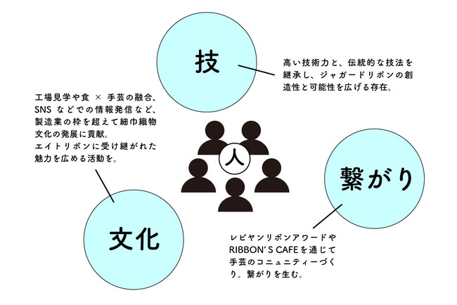RIBBON'S CAFE・オリジナルリボンブランドであるレピヤンリボンの運営や、一般の方々向けの工場見学といった挑戦を続け、この工場と、この工場の持つ可能性を残すことで、いつかエイトリボンがチロルリボン業界を牽引していく存在になり、産地にとって、日本にとって、財産になるような工場になっていくと信じています。