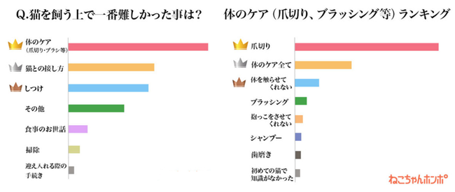 全国の猫を飼っている300名を対象に実施された「猫を飼う上で一番難しかったこと」に関してのアンケート調査(株式会社ピーネストジャパン(https://nekochan.jp/enq/finish/167)調査期間:2021年3月18日〜4月15日)によれば、猫オーナーの約4割が猫の「体のケア」が難しく、その中でも120人中67人が「爪切り」が難しいと回答し、ダントツ1位の結果となっています(グラフ参照)。