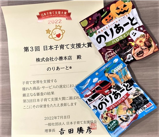 株式会社小善本店(本社:東京都台東区、代表:小林善昭)の、『のりあーと(R)』商品シリーズは、「第3回日本子育て支援大賞2022」(主催:一般社団法人 日本子育て支援協会)を受賞しました