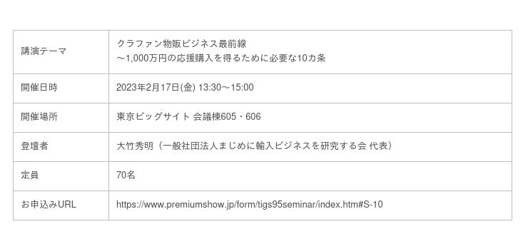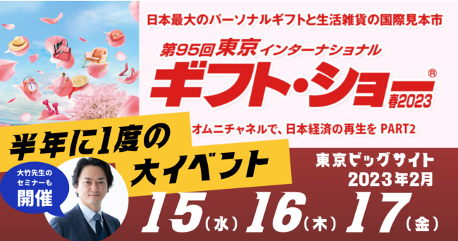 3大クラウドファンディング、Makuake・CAMPFIRE・GREENFUNDINGの史上唯一の公式パートナーでもあるクラファン物販の第一人者の大竹秀明が、来月開催される「第95回東京インターナショナル・ギフトショー2023春」にて3回目のセミナー講演をいたします。