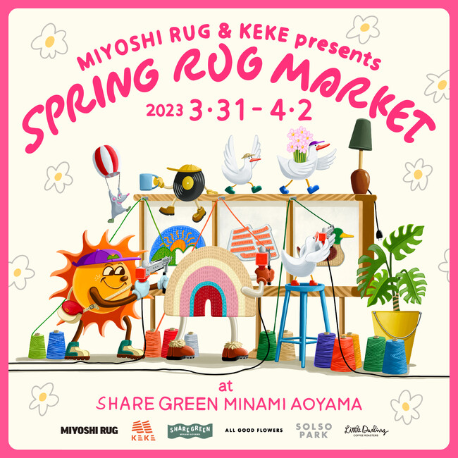 株式会社毛毛(所在地:東京都台東区、代表:中武薫平)が運営する「tufting studio KEKE」と徳島県のラグ工場「MIYOSHI RUG」は、2023/3/31(金)〜4/2(日)に、SHARE GREEN MINAMI AOYAMAにて、初となる合同ラグイベント"MIYOSHI RUG&KEKE presents SPRING RUG MARKET"を開催いたします。