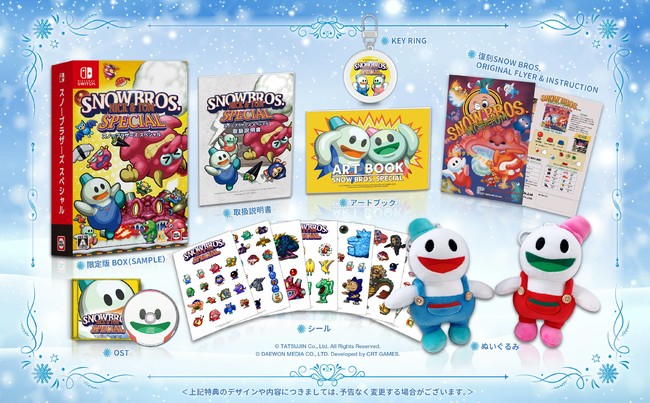 5月19日Nintendo Switch™で展開される『スノーブラザーズ スペシャル』は、パッケージ版(通常版3,960円、コレクターズエディション8,960円)とダウンロード版(1,960円)+モンスターチャレンジDLC(960円)が発売されます。限定数量のコレクターズエディションは主人公ニック&トムのぬいぐるみや復刻フライヤー及びインストラクションカード、オリジナルアートブック、オリジナルサウンドトラックCD、シール、キーリングなどのオリジナルグッズ満載でファンの方には見逃せない内容となっています。通常版も初回限定でステッカー(3枚)、マニュアル本がおまけにつきます。